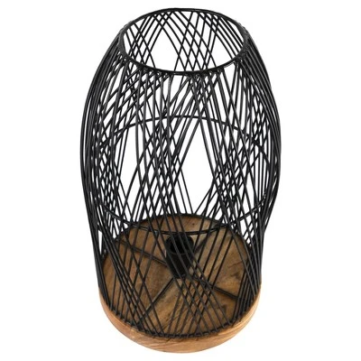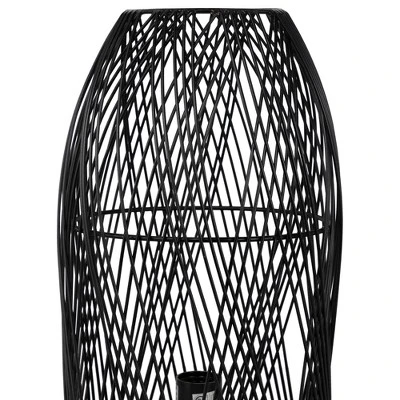 Add a touch of industrial charm to your space with this iron table lamp. The cage-style design exudes a vintage vibe, perfectly complemented by a sturdy wood base in a sleek black finish. Ideal for both modern and rustic interiors, this lamp provides a warm, inviting glow while serving as a striking decorative piece.Product Features:Base: E26Lamp uses (1) 60 watt bulbs – not included2-way button switchWire color: blackCord length: 7.5′ UL listed for indoor use 120 volts, 60 hertz, 7 wattsDimensions: 15.25″H x 9βW x 9βDMaterial(s): iron/wood