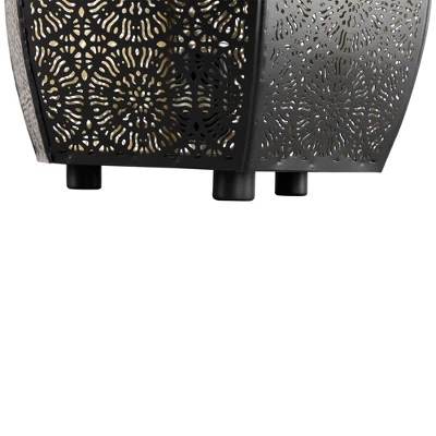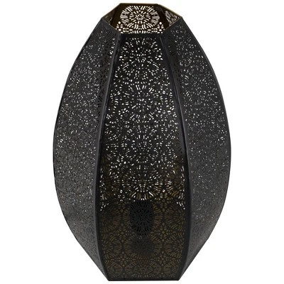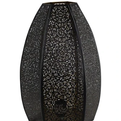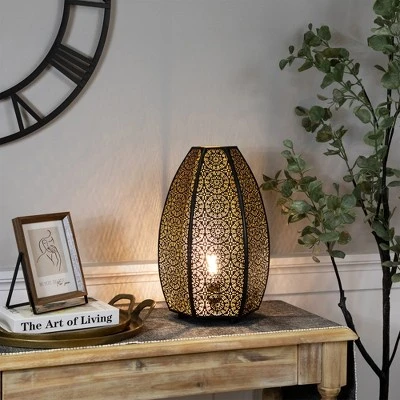 Enhance your indoor decor space with this enchanting table lamp. This lamp features an elegant laser-cut mandala design, perfectly paired with a brushed black casing and a gold-tone interior for a touch of sophistication. It stands securely on three 1-inch round iron legs and includes an electrical black cord with a convenient on/off switch. UL certified for indoor use, this lamp requires no assembly, making it an effortless addition to any room.Product Features:Base: E26 bulb baseLamp uses (1) 60 watt bulbs (not included)2-way button switchWire color: BlackCord length: 7.5’UL-certified for indoor use120 volts, 60 hertz, 7 wattsDimensions: 15.75″ high x 10.5β diameterMaterial(s): iron
