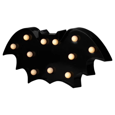 Add some light to your Halloween decor with this illuminated marquee sign. It features a spooky bat and will be sure to send a chill down your spine. Great for parties or use as a nightlight. Product Features:Illuminated by 11 LED lightsColor: warm white bulbsOne-sided designLED lights use up to 80% less energy Bulbs stay cool to the touchRequires (2) AA size batteries; not includedConvenient on/off switch on the backComes ready-to-hang with keyhole hooks on the backRecommended for indoor decorative use onlyDimensions: 4″H x 12″W x 1″DMaterial(s): plastic